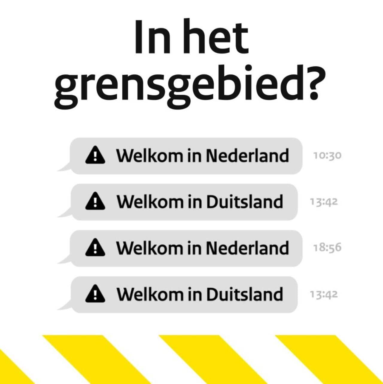 In het grensgebied? Welkom in Nederland, welkom in Duitsland, welkom in Nederland, welkom in Duitsland. Wat er ook gebeurt, download de app NL-Alert. Download nu de app.