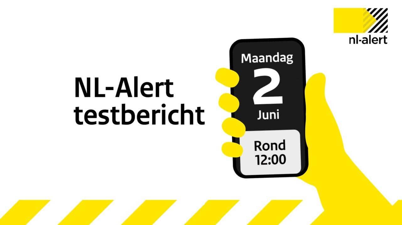 NL-Alert testbericht maandag 2 juni rond 12:00. Let op: geluid testbericht kan hard binnen komen via je koptelefoon.